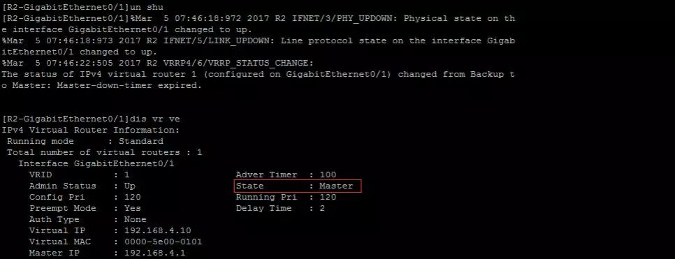 当路由器处于Master状态时,将定期发送VRRP广播报文。响应对虚拟IP地址的ARP请求,并且响应的是虚拟MAC地址,而不是接口的真实MAC地址。转发目的MAC地址为虚拟MAC地址的ip报文。如果它是这个虚拟IP地址的拥有者,则接收目的的IP地址就为这个虚拟IP地址的ip报文,否则丢弃这个IP报文。在Master状态中,路由器只有接收到比自己的优先级大的VRRP报文或者VRRP报文携带的优先级等于本地优先级,且报文携带接口ip大于本地接口ip时,才会转为Backup。当路由器接收到接口的Shutdown事件时,将转为Initialize状态。