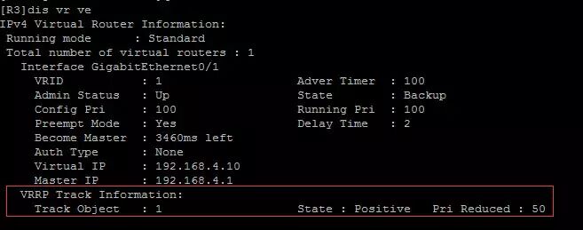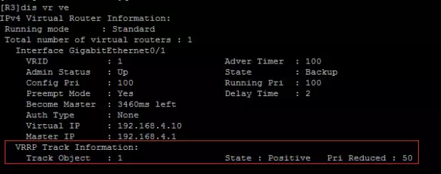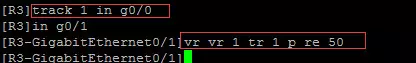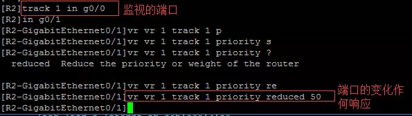 R2(注意:端口监视,就是当track监视的端口down时将会把该备份组的优先级降低50)